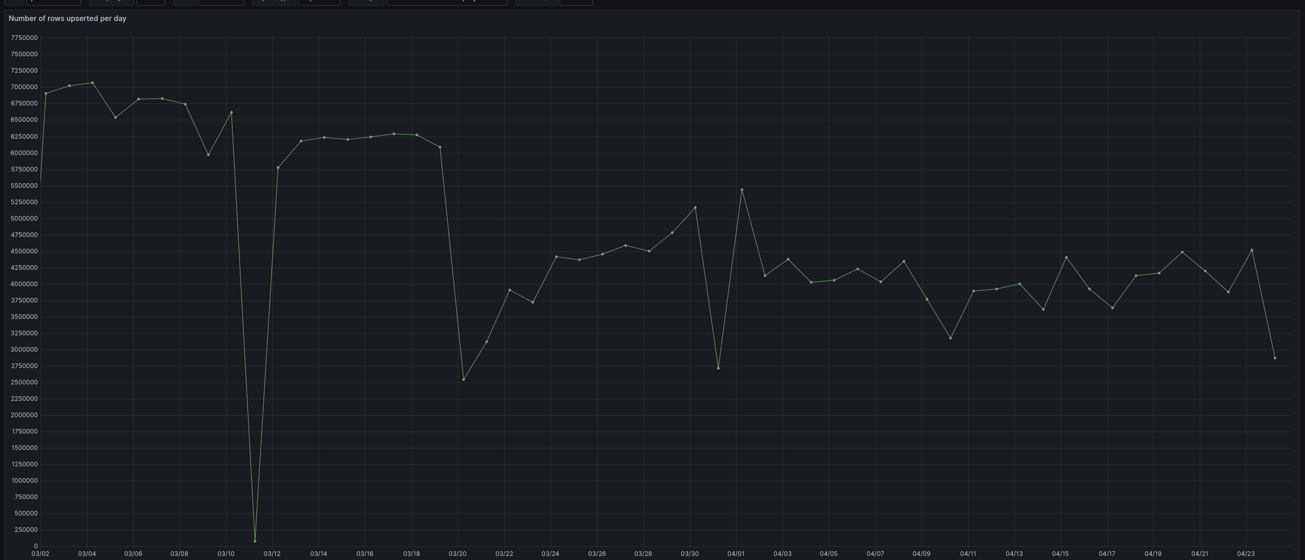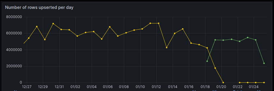 The team actually identified that the initial improvements in Facebook surveys were below their expectations. After an investigation and detailed review of the pipeline, we found that there was a bug identified on Facebook regarding this information. The team has resolved it, and the upserts dropped further in FB (see next graph). A design change is planned in the rule system to reduce redundant task processing and reduce upserts further.