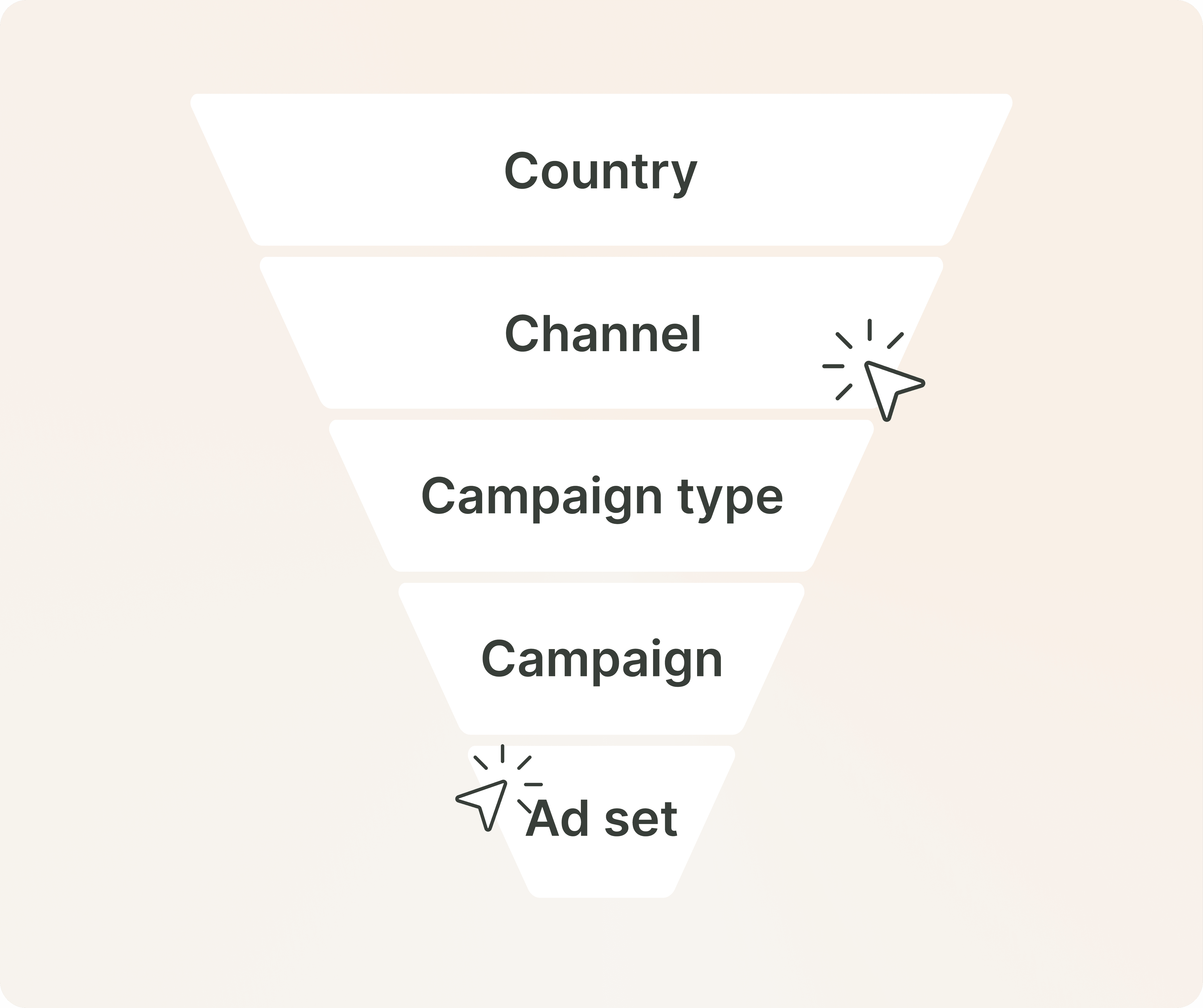 Slice and dice your performance by country, channel, product category, new vs. existing customer, and device type. Set up custom dimensions to filter by campaign type, goal, audience group, creative concept, or similar.